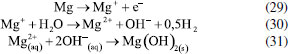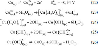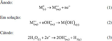 Os pesquisadores Dura et al.,126 compararam a eficiência de duas ligas com diferentes concentrações de crômio e concluíram que a AISI 420 apresenta boa dissolução anódica e eficiência na remoção de fosfato, íons zinco e corante Alaranjado II. O desempenho é próximo àquele observado para ânodos de ferro puro, porém com reduzida formação de óxidos indesejados. No estudo de Mahmad et al.,135 o ânodo de aço inoxidável apresentou, em comparação com ânodo de alumínio, maior eficiência na remoção de crômio do rejeito, porém uma menor eficiência na remoção de turbidez. No trabalho de Murthy et al.,110 observa-se que o processo de eletrocoagulação com eletrodos de aço inoxidável foi capaz de remover 93% de Sr(II), enquanto uma remoção de apenas 77% foi observada quando testado em eletrodos de alumínio. Alguns pesquisadores têm demonstrado que o aço inoxidável pode ser um bom material quando usado como cátodo em processos com ânodos de Fe ou Al, influenciando a velocidade da passivação desses eletrodos.3,136 Estudos recentes têm investigado o desempenho de ligas de alumínio como ânodos de sacrifício no processo de eletrofloculação como alternativa para contornar os efeitos de passivação observado nos ânodos de alumínio convencionais. Os metais utilizados na fabricação dessas ligas, geralmente zinco, magnésio ou índio, são capazes de ativar o alumínio, isso é, acelerar a formação de rachaduras no filme de óxido (Al2O3) aderido à superfície do eletrodo,54 permitindo que a dissolução anódica seja contínua durante o processo de dissolução do alumínio na liga.137,138 O uso de ligas de alumínio contendo Zn (1-4%), In (0,006-0,025%), Fe (0,15%) e Si (0,15%) como ânodos em sistemas com cátodo de aço inoxidável também foi investigada para remediação de água contaminada por fosfato em processos de eletrofloculação.102 Sob condições otimizadas de pH= 7,0 e densidade de corrente 0,2 A dm-2, o sistema apresentou uma eficiência de remoção de 99% quando a liga de alumínio foi utilizada, um resultado superior em relação ao obtido com o uso de ânodos de alumínio puro (remoção de 85%). Ligas de alumínio com magnésio e zinco (Mg-Al-Zn) também foram utilizadas como ânodo de sacrifício104 no estudo da eletrofloculação de solução contaminada por fluoreto. Sob condições otimizadas, o método alcançou a remoção de 96% de fluoreto em solução. Ligas de Al- Zn-In, nas mesmas condições experimentais, também mostraram ótimos resultados para remoção de crômio (98,2%), e corante Alaranjado II (96%), após 30 minutos de tratamento por eletrofloculação109 e desempenho superior em comparação com a liga Al-Mg, a qual promoveu a remoção de 88-93% de fosfato, 96% de Zn2+ e 50-60% do corante Alaranjado II.55 Cobre O uso de cobre como ânodo de sacrifício baseia-se na facilidade da reação de oxidação de Cu metálico durante o processo de eletrocoagulação (Equação 22). Os íons Cu(II) liberados formam o complexo hexa(aqua)cobre (II) (Equação 23), o qual, em contato com íons OH- produzidos pela redução da água no cátodo, formam o agente coagulante hidróxido de cobre (II) (Equação 24).139 Em meio alcalino, há a subsequente desidratação do hidróxido de cobre (II), formando óxido de cobre (II) (Equações 25 e 26), de acordo com as reações propostas por Cudennec e Lecerf:140 ![]() Estudos de Hernández et al.122 demonstraram que a eletrofloculação com ambos os eletrodos (ânodo e cátodo) de cobre promoveram a redução de apenas 38% de demanda química de oxigênio (DQO) e 27% do carbono orgânico total (COT), quando aplicados no tratamento de águas residuárias de indústria de bebidas. Em condições otimizadas de pH=8 e densidade de corrente de 68 mA cm-2, observa-se baixa eficiência, que é associada à alta complexação da matéria orgânica com íons de cobre formados em solução. De acordo com os autores, a concentração de cobre em solução alcançou o valor de 47,4 mg L-1 na água tratada. No entanto, García-García et al.120 têm demonstrado que eletrodos de cobre, quando usados em processo de eletrocoagulação em condições otimizadas em pH=4 seguido de eletro-oxidação, podem ser uma excelente ferramenta para tratamento de rejeito industrial. Após o tratamento com eletrodos de cobre, alcançou-se 89% na remoção de demanda química de oxigênio e 97% da coloração foi obtida em pH=4. Os autores sugerem que a alta concentração de íons CO32-, SO2-, PO3- e Cl- no efluente conferem estabilidade química ao processo de eletrocoagulação com eletrodos de cobre pela sua capacidade de complexação. O estudo da eletrocoagulação com ânodo de cobre foi demonstrado ser uma alternativa eficiente para remoção de partículas de grafeno em suspensões ácidas. Os íons Cu2+, gerados sob corrente alternada, adsorvem especificamente, formando filmes de grafeno141 na superfície com grande possibilidade de serem utilizados em aplicações anticorrosivas e na fabricação de dispositivos eletrônicos. Os estudos ainda reportam que o uso de corrente alternada durante a eletrocoagulação minimiza a drástica corrosão do ânodo devido à oxidação, aumentando o tempo de vida do eletrodo. No entanto, embora o eletrodo de Cu apresente grande possibilidade de aplicação como ânodo de sacrifício em eletrofloculação, sua potencialidade tem sido limitada pela possibilidade de formar resíduos indesejados na água tratada. Isso é, apesar do cobre ser um nutriente essencial para o desenvolvimento de plantas e funcionamento dos organismos vivos, quando presente em quantidades excessivas na água é considerado um contaminante com potencial toxicidade,23,142,143 que deve ser evitado. Níquel O uso de eletrodos de níquel em métodos de eletrofloculação para tratamento de água é pouco reportado na literatura. Em um estudo mais recente, Wang et al.,131 demonstraram que el