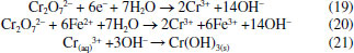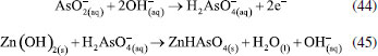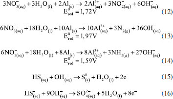 O efeito da adição de haletos à solução como alternativa para melhorar a eletrofloculação sobre eletrodos de Ti também foi investigado.150,151 Na presença de íons Br- por exemplo, o potencial de corrosão de Ti é de aproximadamente 1,4 V vs. Ag/AgCl.152 E a reação dos óxidos (Ti2O3 e TiO2) de titânio com íons haletos formam espécies mais solúveis que, ao serem solubilizadas, deixarão exposta a superfície do metal. Uma grande vantagem do uso do titânio em processos de eletrofloculação é a produção de um agente coagulante não tóxico que apresenta as características essenciais para desestabilizar emulsões no processo de eletrocoagulação, como destacado por Al-Ghafri et al.,153 além do próprio titânio ser um metal não tóxico e relativamente barato. Zinco Uma vez em solução, os íons Zn2+ gerados pela eletrodissolução do ânodo de zinco (Equação 41) em processos de eletrofloculação, darão origem ao seu hidróxido correspondente, seja pela reação com íons hidroxila em meio alcalino (Equação 42), seja pela reação com água em meio ácido (Equação 43), o qual agirá como agente coagulante no sistema. ![]() ![]() Hussin et al.,154 tem demonstrado que a utilização de ânodo de zinco pode ser aplicado com sucesso na remoção de chumbo (II) em águas residuárias. O processo apresentou eficiência de 99,9% em 10 minutos de tratamento, sob densidade de corrente igual a 1,13 mA cm-2. Zinco também foi utilizado como ânodo de sacrifício por Mohd et al.,155 no estudo de remediação de uma solução aquosa contendo arsenito. A forte adsorção do arsenito no eletrodo na faixa de pH entre 2 e 7, e conversão do arsenito em arsenato (Equação 44), favorece a formação preferencial de H2AsO-. Na sequência, há a formação de um complexo insolúvel entre o arsenato e o hidróxido de zinco gerado in situ (Equação 45) favorecendo a remoção de 99,89% de arsenito no processo. Para isto, as melhores condições de tratamento foram obtidas para concentração inicial de arsenito 2,0 mg L-1; pH = 6,0; potencial aplicado 30 V; tempo de reação 16 minutos e temperatura de 30 °C. ![]() O trabalho proposto por Fajardo et al.118 tem demonstrado que o uso de zinco como ânodo e cátodo de aço inoxidável em eletrocoagulação é eficaz para remoção de 84,2% de compostos fenólicos e redução de 40,3% de demanda química de oxigênio em águas residuárias. Com o uso dos mesmos materiais do cátodo e ânodo, Safwat et al.130 têm demonstrado a possibilidade de reduzir 66% de ureia em um rejeito sintético, entretanto os pesquisadores observaram que a técnica, quando aplicada no tratamento de amostras reais, apresenta menor eficiência na remoção de ureia, apesar de ser efetiva na remoção de outros compostos poluentes. O trabalho de Aoudj et al.27 traz excelentes resultados para a remoção de dodecil sulfato de sódio, fluoreto e amônia em rejeitos de indústria têxtil pela combinação de eletrocoagulação EC-EF, que também se mostra promissora para a remoção de nitratos em matriz aquosa. Nesse mesmo trabalho, foi verificada uma remoção de 96% para nitratos quando aplicado uma densidade de corrente em torno de 3,2 mA cm-2 dentro de 30 minutos.