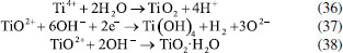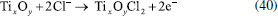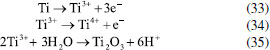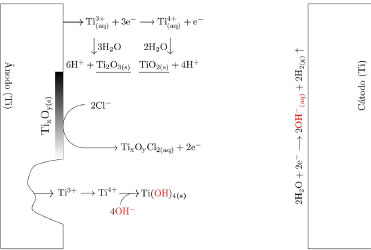 ![]() Figura 4. Esquema do sistema de eletrocoagulação com eletrodos de titânio mostrando a reação catódica, reações anódicas (formação de íons Ti3+ e Ti4+), formação de filmes de óxidos de Ti(III) e Ti(IV) e a dissolução dos filmes na presença de ânions de cloro
