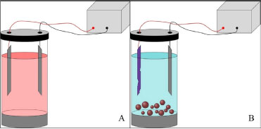 ![]() Figura 1. Representação dos sistemas eletroquímicos para tratamento de água antes do processo de eletrocoagulação (A) e depois do processo (B)