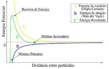 ![]() Figura 3. Perfil de energia potencial versus distância entre partículas em uma suspensão coloidal estável segundo a Teoria DLVO. Adaptado da ref. 70