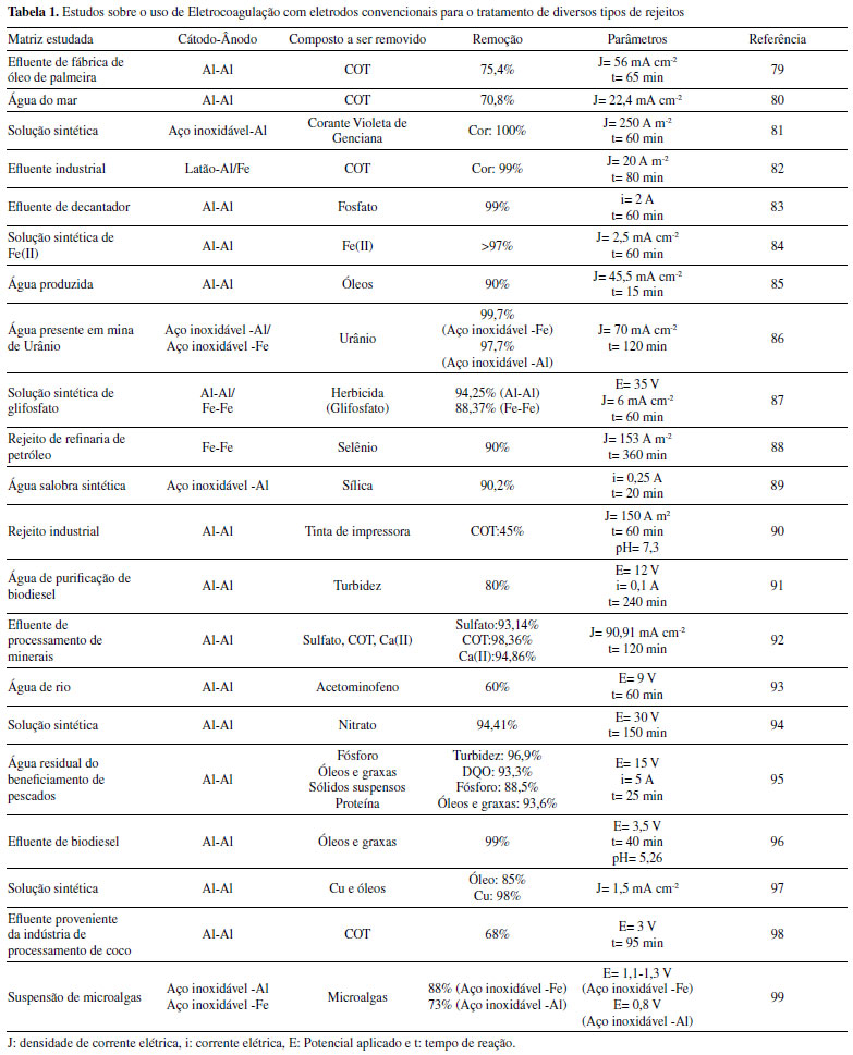 PERSPECTIVAS FUTURAS A eletrocoagulação é uma técnica conhecida e bastante estudada pelo meio acadêmico. Há na literatura uma grande quantidade de estudos envolvendo a aplicação dessa técnica para o tratamento de água, sendo que muitos desses estudos têm como objetivo encontrar, experimentalmente e/ou estatisticamente, as melhores condições de trabalho para tratar um determinado efluente com um arranjo específico de eletrodos, como pode ser observado pelas Tabelas 1 and 3. Contudo, há certa escassez na literatura de trabalhos que buscam estudar e elucidar, de maneira sistemática, as regras que regem o projeto de reatores para a eletrocoagulação.160 Isso ocorre por causa da complexidade das interações envolvidas no processo e, consequentemente, da falta de conhecimento sobre essas interações, o que dificulta a implementação dessa tecnologia em escala industrial.161 Para que a técnica possa ser amplamente utilizada em grandes escalas, é preciso que haja pesquisas que mostrem, de maneira aprofundada, as complexas interações que ocorrem no sistema, bem como proponham modelos matemáticos mais completos, que tornarão possível a construção de reatores mais eficientes e econômicos. Ademais, pode-se destacar a importância do desenvolvimento de novas estratégias para minimizar a formação de camadas passivantes nos eletrodos, que diminuem a eficiência do tratamento,162 principalmente estratégias que não necessitam da adição de produtos químicos ao sistema, de forma a evitar poluição secundária. Uma estratégia interessante que vem sendo adotada é a aplicação de corrente alternada no processo, a qual retarda a passivação do cátodo e diminuí a deterioração do ânodo.162,163 Dessa forma, é essencial a busca por diferentes formas de evitar o rápido desgaste dos eletrodos, tornando o processo mais econômico, ao mesmo tempo que a eficiência é aumentada. O estudo de eletrodos não convencionais, que já foi amplamente discutido ao longo deste trabalho, é de suma importância para o desenvolvimento de tratamentos de diversas matrizes sem os problemas associados aos eletrodos convencionais.15 Nesse sentido, pode-se destacar a importância de estudos voltados ao acoplamento da eletrocoagulação com outras técnicas de tratamento e desinfecção de água.33,34,164