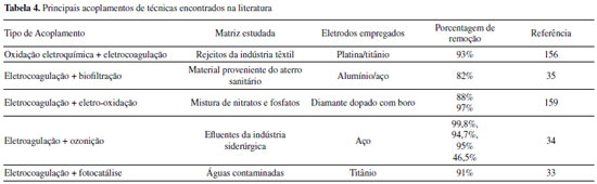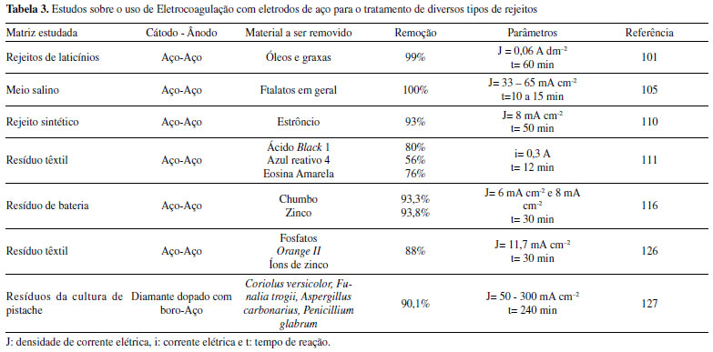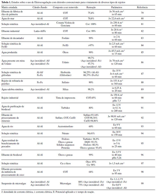 | Eletrocoagulação/eletrofloculação para tratamento de águas residuárias: eletrodos não convencionais e acoplamento de técnicas Electrocoagulation/electrofloculation for wastewater treatment: non-conventional electrodes and coupling of techniques |