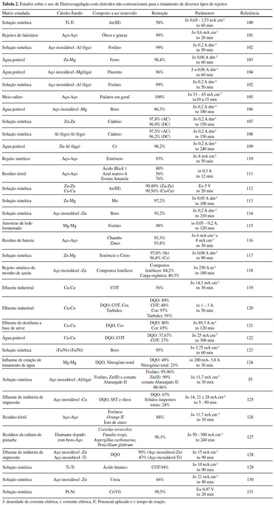 De modo geral, o sucesso da eletrocoagulação/eletrofloculação pode ser justificado principalmente pela adição controlada dos agentes coagulantes, em relação aos métodos de coagulação/flotação convencionais, por meio da geração in situ via dissolução de um dos eletrodos. No entanto, é importante ressaltar que essas características também controlam o tempo de vida dos eletrodos, danificados pela corrosão durante o processo. Assim a técnica se depara com a necessidade de substituição regular dos eletrodos devido a processos de passivação ou dissolução inerentes do processo, diminuindo a eficiência/economia do processo. O consumo energético algumas vezes também pode ser alto em relação aos métodos convencionais e o uso de eletrólitos para alta condutividade do efluente também deve ser considerado. Desse modo, estudos direcionados para o uso de novos materiais eletródicos ou combinação de métodos de tratamento acoplados à eletrofloculação tem norteado a busca por soluções menos dispendiosas e mais ambientalmente amigáveis. Eletrodos não convencionais A configuração dos eletrodos, bem como o material que os compõem, são importantes parâmetros que afetam drasticamente o desempenho do processo de eletrocoagulação. Como mostrado anteriormente, os eletrodos de Alumínio e Ferro são os materiais mais utilizados em aplicações para tratamento de água contaminada, tendo em vista o baixo preço desses materiais e a boa eficiência que proporcionam. Entretanto, devido às controvérsias quanto a utilização desses materiais, causadas pelos problemas associados a eles, a busca por eletrodos não convencionais que possam apresentar novas alternativas para tratamento por eletrocoagulação/eletrofloculação tem sido estimulada.15 Desse modo, são compilados na Tabela 2 alguns trabalhos relevantes sobre o uso de alguns eletrodos diferentes daqueles comumente usados a base de Al e Fe, com o intuito de comparar de modo crítico o desempenho de eletrodos não convencionais como ânodos de sacrifício na técnica de eletrocoagulação/eletrofloculação para o tratamento de água. Uma amostragem desses trabalhos mostra que diferentes arranjos de cátodos/ânodos são utilizados em sistemas de reatores para eletrocoagulação/eletrofloculação, em que os ânodos mais comuns são Ti, Zn, Cu, Ni, aço inoxidável e Mg. Esses sistemas mostram alto desempenho na remoção de compostos orgânicos e metálicos em matrizes variadas. A seguir, descrevemos as principais contribuições de cada eletrodo usado como ânodo de sacrifício, para o avanço da técnica como alternativa no desenvolvimento de novos métodos para tratamento de amostras ambientais.
