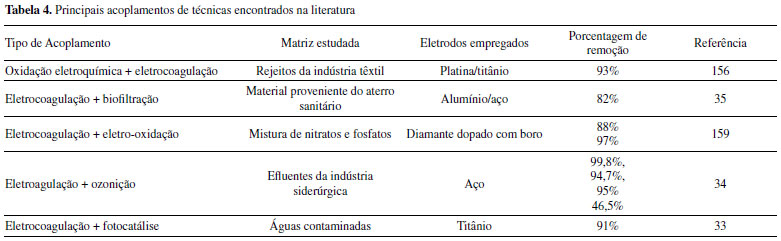 ACOPLAMENTO DE ELETROFLOCULAÇÃO E OUTROS MÉTODOS DE TRATAMENTO O acoplamento da técnica de eletrofloculação para a remoção prévia de contaminantes brutos em águas residuárias (óleos, graxas e sólidos suspensos) em etapa anterior ou posterior a outros métodos de tratamento, tem sido bastante discutido na literatura. O trabalho executado por Chanikya et al.156 traz um exemplo relevante a respeito da junção de técnicas eletroquímicas para o tratamento de efluentes têxteis. No estudo realizado, a combinação do processo de oxidação eletroquímica avançada (POEA) com a eletrocoagulação (EC) utilizando placas de platina/titânio e ferro como ânodo e cátodo respectivamente em ambos os processos, foi verificado um relevante sinergismo entre as técnicas, promovendo uma diminuição de 93% da demanda química de oxigênio do efluente proveniente da indústria de corantes, com um menor consumo específico de energia e menor geração de lodo. Uma grande quantidade de estudos tem apontado que a eletrocoagulação é um tratamento eficiente para águas residuais de indústria com um nível significativo de poluição como método preliminar.27-32 Mas pode atingir níveis de remoção muito mais adequados, quando combinado a outros processos de tratamento. Por exemplo, o acoplamento do processo EC com processos biológicos, químicos ou processos de oxidação avançada pode promover a obtenção de uma água muito mais pura e melhor conformidade com as normas ambientais. O acoplamento de EC com a biofiltração tem sido proposto por Dia et al.,35 para tratamento de materiais lixiviados de aterro sanitário. De acordo com os autores, o tratamento apresentou alta eficiência para diminuição da demanda química de oxigênio, fósforo, metais, amônia e demanda bioquímica de oxigênio. Vários outros estudos têm explorado a combinação entre eletrocoagulação e eletro-oxidação.27-29,31,32,157,158 O resultado do tratamento combinado mostrou-se muito satisfatórios para águas residuais da indústria de curtumes e agroalimentares, além da redução do consumo de energia usualmente gerado em um tratamento utilizando-se apenas eletro-oxidação. A influência dos principais parâmetros operacionais em eletrodos de aço para a remoção simultânea de nitratos e fosfatos em matrizes complexas assim como o melhoramento da eficiência do processo EC por meio do acoplamento com métodos eletroquímicos foi também estudada por Ghazouani et al.159 Tal combinação resultou na oxidação da amônia gerada, melhorando consideravelmente a qualidade das águas residuais tratadas. Em adição, o método combinado ofereceu um consumo de energia por unidade de poluente de 0,99 kW h kg-1 N-1, e mudança de cinética de remoção para os fosfatos, nitratos e outros compostos nitrogenados. O acoplamento da técnica de eletrofloculação com ozonização também se mostrou bastante eficiente para a remoção de cianeto e cloreto em efluentes da indústria siderúrgica.34 A integração das técnicas forneceu um resultado altamente satisfatório, configurando uma remoção de 99,8%, 94,7%, 95% e 46,5% para íons cianeto, cloreto e para a demanda química de oxigênio (DQO) e demanda bioquímica de oxigênio (DBO), respectivamente. A literatura também reporta a associação de eletrofloculação com fotocatálise. Para isso, Boroski et al.33 demonstram que titânio pode ser um ânodo promissor, quando o lodo gerado é seco, calcinado e usado em fotocatálise. Isso é, o material gerado como resíduo na eletrofloculação pode ser relevante na fabricação de nanopartículas de dióxido de titânio (TiO2), a serem usados como semicondutor fotoativo. De acordo com os autores, esse material, quando submetido a irradiação UV, age como catalisador na degradação de poluentes em águas contaminadas, gerando um eficiente processo fotocatalítico. A eletrocoagulação sobre eletrodos de Fe associada ao tratamento fotocatalítico usando TiO2 também foi aplicada em efluentes farmacêuticos, industriais e cosméticos, os quais são descritos na literatura.33 A subsequente fotocatálise após a eletrocoagulação reduziu drasticamente os contaminantes refratários do efluente. A análise da Tabela 4 permite verificar que é possível realizar o acoplamento de técnicas juntamente com a eletrocoagulação e sobretudo verifica-se um acoplamento com técnicas eletroquímicas, envolvendo processos oxidativos avançados. Dentre as técnicas empregadas, a fotoeletrocatálise entra como uma técnica que abre bastante perspectivas no quesito acoplamento de técnicas.