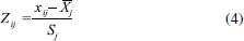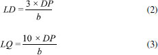 Linearidade, limite de detecção e limite de quantificação A linearidade de um método é definida como sua capacidade de fornecer um sinal (y) que é diretamente proporcional à concentração do analito (x). Essa relação é expressa pela equação matemática denominada curva de calibração. A estimativa dos coeficientes de uma curva de calibração pode ser efetuada a partir do método matemático conhecido regressão linear, onde além dos coeficientes de regressão (a e b), também é possível calcular o coeficiente de correlação (r).17 A correlação representada pelo modelo matemático entre x e y é representada pelo coeficiente de correlação (R), como demonstra a equação 1. ![]() O limite de detecção (LD) é um parâmetro que representa a menor concentração da substância em análise possível de ser detectada, mas não necessariamente quantificada, utilizando um determinado procedimento experimental. O limite de quantificação (LQ), por outro lado, representa a menor concentração quantificável da substância em estudo.17 Os limites de detecção (LD) e quantificação (LQ) foram obtidos através das seguintes equações 2 e 3: ![]() onde: DP = desvio padrão do branco; b = coeficiente angular da reta. Análises estatísticas O tratamento estatístico multivariado foi realizado através das ferramentas Análise Hierárquica de Clusters (HCA) e Análise de Componentes Principais (PCA), por meio de um software, o Unscrumbler X versão 10.4, permitindo assim, fazer a classificação das amostras em função de sua origem geográfica e, como consequência, demonstrar um indicativo de poluição ambiental. Como pré-processamento, a matriz de dados foi auto-escalonada, no que consiste em centrar os dados na média e dividi-los cada um pelo desvio padrão (Equação 4), de modo que todas as variáveis tenham a mesma importância, ou seja, o mesmo peso.18 ![]() onde: xij = valor para o objeto i da variável j;
