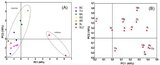 ![]() Figura 2. (A)Gráfico de scores de PC1 versus PC2 das concentrações de metais nas amostras de mel. BC - Bacabeira; TU - Tutóia; BA - Barreirinhas; SD - São Domingos; AR - Araguanã; SL - Santa Luzia; SLZ - São Luís. (B) Gráfico de Loadings (PC1 vs PC2) aplicado às variáveis