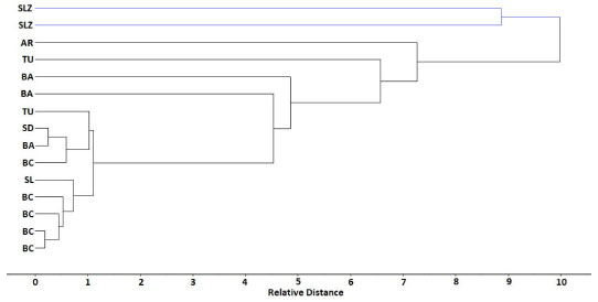 ![]() Figura 3. Dendrograma de HCA de amostras de mel de diferentes regiões do Maranhão. SLZ - São Luís; AR - Araguanã; TU - Tutóia; BA - Barreirinhas; SD - São Domingos; BC - Bacabeira; SL - Santa Luzia.