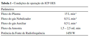 Preparação das amostras de mel Para a mineralização das amostras, o método utilizado foi a decomposição por via úmida em sistema aberto com aquecimento convencional, proposto por Perrielo Leme et al., com algumas adaptações e modificações com relação à massa da amostra e ao volume do ácido utilizado.14 As proporções dos reagentes oxidantes foram estabelecidas após algumas análises onde a quantidade de ácido puro utilizado foi eficiente na degradação da matéria orgânica. Foram pesados 0,3 g de amostra de mel em tubos de vidro borosilicato e adicionados 3 ml de HNO3 (TEDIA) com auxílio de micropipeta. A mistura passou por uma digestão prévia em repouso sob temperatura ambiente, por um período de 15 h. Após esse período, adicionou-se 1 ml de H2O2 (30% mm-1) (Emsure® MERCK) aos frascos e deixou-se em repouso por mais 2 h. Então, a mistura foi aquecida a 100 °C gradativamente em bloco digestor (Tecnal, modelo TE-040/25) por um período de 3 h, e os tubos foram parcialmente tampados com auxílio de vidros de relógio a fim de evitar contaminação cruzada. Ao final do processo, esperou-se a solução arrefecer até a temperatura ambiente, transferiu-se para tubos tipo Falcon estéreis e todas as amostras foram avolumadas para 30 ml com água deionizada (Milli-Q® System Millipore, USA). De maneira semelhante, digestões sem amostras de mel, empregadas como branco também foram submetidas ao mesmo procedimento de digestão. Cada análise foi realizada em triplicata. Curva de calibração Uma curva analítica foi preparada utilizando-se soluções de ácido nítrico 5%, água deionizada e um padrão Multielementar com certificado SpecSol, do qual foi preparado uma solução-estoque que serviu de base para as soluções-padrão. A concentração dos elementos nas soluções analíticas variou de 10 a 500 μg L-1, sendo a faixa linear para o Fe, Ba e Li (10 100 μg L-1); para o Cd, Ni, Pb, Ag, Cu, Co, Cr, Mn, Zn, K, Mg, Al, Ga, In, Sr (10 250 μg L-1) e para o B (10 500 μg L-1). As soluções finais foram avolumadas em balões de 25 e 50 ml. As análises foram realizadas utilizando-se um Espectrômetro de Emissão Óptica com Plasma Indutivamente Acoplado, ICP OES Perkin Elmer, modelo Optima 7000 DV. As configurações de operação (Tabela 1) foram determinadas com base no manual do equipamento e em referências de estudos feitos com análise de ICP OES em matriz de mel. Também foram selecionadas as linhas espectrais referentes aos metais escolhidos para as análises. As linhas espectrais foram pré-estabelecidas para os seguintes metais: Cd (226.502 nm), Ni (221.648 nm), Pb (220.353 nm), Cu (324.752 nm), Ag (328.068 nm), Co (228.616 nm), Cr (267.716 nm), Mn (257.610 nm), Zn (213.857 nm), K (766.490 nm), Mg (279,553 nm), Fe (259,939 nm), Al (396.153 nm), Ga (417.206 nm), In (325.609 nm), Ba (455.403 nm), Sr (407.771 nm), Li (670.784 nm), B (249.677 nm).15-16