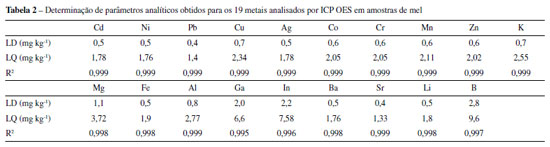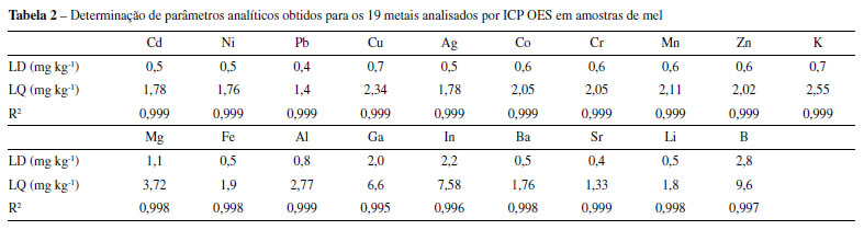 RESULTADOS E DISCUSSÃO A faixa de linearidade estudada (10 a 500 μg L-1) exibiu valores do coeficiente de correlação satisfatórios, variando entre 0,995 - 0,999, como mostrado na Tabela 2. Os elementos como Cd, Ag, Co, Cr e Li apresentaram valores abaixo limite de detecção (LD) e limite de quantificação em todas as amostras. Os valores aqui encontrados podem ser comparados com estudos feitos com méis de diferentes origens, como por exemplo, Conti et al.19 que fez uso da técnica de ICP OES para a determinação de metais em mel, encontrou valores comparáveis para Mg (LD-2 mg kg-1), Fe (LD -3 mg kg-1), Al (LD -1 mg kg-1) e Li (LD - 1 mg kg-1), por exemplo.