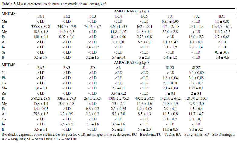 Massa característica dos elementos químicos Ainda que não existam valores máximos permitidos na legislação para todos os elementos investigados para a matriz de mel, os resultados apresentados sugestionam o uso do mel como uma proposta de monitoramento da qualidade ambiental. Além disso, pode prospectar uma possível aplicação do mel para estudos de autenticidade de origem geográfica, com base na estimativa do seu conteúdo de elementos inorgânicos. Na tabela 3, observa-se que, dentre as amostras analisadas, a amostra "SLZ2" foi a que apresentou mais elementos em sua composição, incluindo alguns potencialmente tóxicos como Ni e Pb. Os níveis de variação da massa característica dos metais podem ser explicados principalmente por sua origem botânica e geográfica além da influência de fatores antropogênicos.