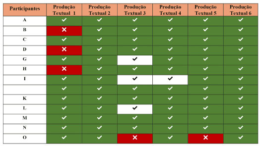 ![]() Figura 1. "retrato" das entregas das produções textuais que compunham o portfólio do grupo de participantes da pesquisa. Legenda: : produções textuais completas. : produções textuais não entregues. ✔: produções textuais entregues de maneira incompleta