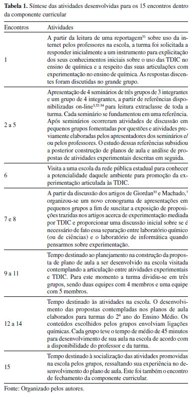 PROPOSIÇÕES PROBLEMATIZADORAS SOBRE EXPERIMENTAÇÃO ASSOCIADA ÀS TDIC NA FORMAÇÃO INICIAL DE PROFESSORES DE QUÍMICA A proposta formativa foi desenvolvida em 15 encontros dentro de uma componente curricular que integra o 5º semestre de um curso de licenciatura em Química de uma universidade pública brasileira. Os encontros eram semanais e duravam 200 minutos cada e a turma possuía 13 estudantes. É importante ressaltar que a proposta formativa foi desenvolvida antes da pandemia ocorrida pelo vírus SARSCoV-2.41 Dado o ensino remoto estabelecido em nosso país em decorrência da pandemia, entende-se que isto pode refletir, em alguma medida, nas possibilidades de articulação entre as atividades experimentais e as TDIC sinalizadas por docentes. Contudo, nesta pesquisa são considerados os conhecimentos a respeito dessas possibilidades de articulação constituintes de uma consciência real efetiva e de uma consciência máxima possível. Estudos que consideram o contexto pandêmico da atualidade sugerem que não obrigatoriamente esse influenciou no conhecimento docente acerca das atividades experimentais ou das TDIC havendo conhecimentos problemáticos sobre ambas,42 reforçando conhecimentos já disseminados em pesquisas preliminares a respeito das atividades experimentais.43 Os conteúdos estudados na proposta formativa foram: a experimentação no ensino de química; tecnologias digitais da informação e comunicação na educação, em geral, e no ensino de química, em particular; articulações entre atividades experimentais e tecnologias digitais da informação e comunicação no ensino de química; softwares educativos e objetos de aprendizagem no ensino de química e, por fim, propostas para o ensino de química de articulação entre atividades experimentais e tecnologias digitais da informação e comunicação. Na Tabela 1 há de maneira resumida a sequência de atividades proposta para o desenvolvimento com o grupo matriculado na componente curricular.