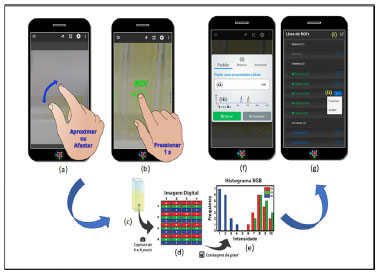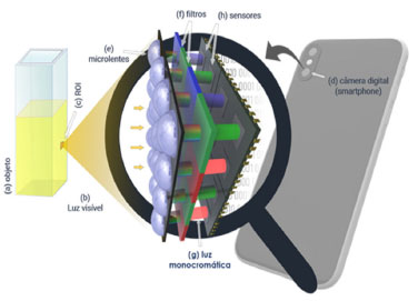 ![]() Figura 1. Transdução da luz visível para ser transformada em matriz numérica (de R, G e B) pelo sensor do dispositivo fotográfico em imagem digital. O objeto (a) real reflete a luz visível (b) e uma região de interesse (c) (ROI) é focalizada para o sensor da câmera digital (d) do smartphone. A câmera possui milhares de microlentes (e) as quais centralizam os feixes luminosos para os filtros (filtros de Bayer) (f) das respectivas cores monocromáticas (g) vermelha (R), verde (G) ou azul (B) traduzidas em sinal elétrico pelos sensores (h)