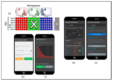 CONCLUSÕES O REDGIM é um aplicativo alternativo para muitos métodos colorimétricos/espectrofotométricos, gerando portabilidade e acessibilidade. O seu acesso é facilitado pela disponibilidade pública e gratuita na plataforma do Google Play de aplicativos Android. A determinação realizada pode ser salva em um arquivo e compartilhado entre smartphones. Nesse sentido, se um trabalho científico for realizado com o aplicativo, encorajamos a disponibilizar também o arquivo da determinação para uma melhor transparência dos resultados. Além disso, o REDGIM aceita a importação de imagem das curvas analíticas, permitindo a análise em outro momento com chance de reprocessamento. Com isso, é possível realizar ajustes como a forma geométrica, a posição e as dimensões da ROI, bem como parâmetros do modelo quimiométricos, como o número de variáveis latentes. Diante de tudo já relatado, o aplicativo permite ainda a exportação dos dados para o software MatLab®, facilitando o uso desses dados em outras abordagens quimiométricas mais específicas não disponíveis no aplicativo. Com base nos resultados obtidos a partir do processamento das imagens, pelo aplicativo REDGIM em comparação com os métodos já validados, observa-se que o modelo se apresentou como potencial ferramenta para quantificação de cloro em água potável e como também para quantificação de canabinóides (CBN) em amostras de maconha e haxixe. A concentração de cloro livre obtida para as duas amostras foi de 0,73 e 0,74 mg L-1 e 0,74 e 0,76 mg L-1 pelo espectrofotômetro e pelo aplicativo (recipiente: cubeta), respectivamente. Já para quantificação de CBN em amostras de maconha e haxixe a concentração média variou de 6,137 a 8,823 mg mL-1 (6,064 a 8,814 mg 100 mg-1). É importante ressaltar que o aplicativo pode ser utilizado para diversas matrizes que utilizam como base a produção de reação colorimétricas, visto que o aplicativo foi desenvolvido sem restrição de análise por matriz. Embora existam modelos muito sofisticados com muito poder de processamento, a ideia do aplicativo é ser uma ferramenta simples e alternativa para os métodos colorimétricos para que seja difundido no meio científico e educacional proporcionando análises rápidas, precisas, robustas, de baixo custo e portátil.