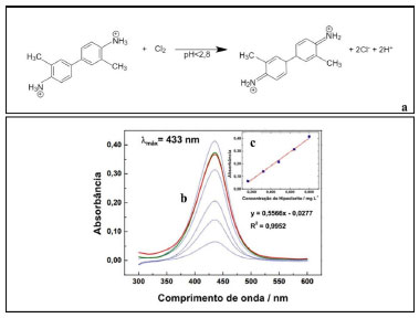 ![]() Figura 4. Oxidação da o-tolidina formando uma imino-quinona (a)41 e varreduras espectrais (b) na faixa de 300 a 600 nm para as 5 soluções padrão de hipoclorito de sódio com concentrações de 0, 160; 0, 320; 0, 480; 0, 640 e 0, 800 mg L-1 e a Amostra 1 e 2 (duplicata). (c) Curva analítica com as absorbâncias máximas em λ máximo = 433 nm