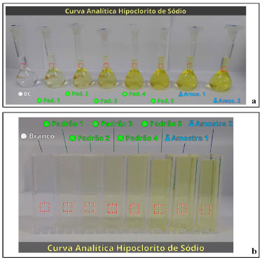 ![]() Figura 5. Imagem única para a curva analítica (a) balão e (b) cubeta na presença das duas amostras de água de torneira, obtidas diretamente da concessionária que administra o abastecimento de água de Aracruz/ES e do branco de calibração/preparação. As concentrações dos padrões de 1 a 5 são iguais a 0, 160; 0, 320; 0, 480; 0, 640 e 0, 800 mg.L-1, respectivamente. As áreas marcadas em vermelho correspondem aos ROI's