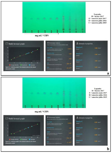 ![]() Figura 6. Placas de cromatográficas reveladas em câmara UV para detecção do canabinóide CBN utilizando sistema de eluição ciclohexano: tolueno: dietilamina 70:20:5% v v-1 e telas do aplicativo após o processamento