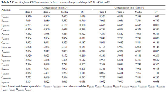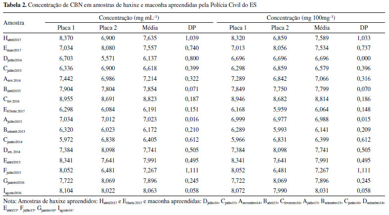 Observa-se, pela Figura 6 e Tabela 2, que as amostras de haxixe (Habril17) e as amostras de maconha (Esetembro17, Djulho16, Cjulho15) apresentaram concentração média de 6,137 a 7,557 mg mL-1 (ou de 6,579 a 7,589 mg por 100 mg de amostra) demonstrando um coeficiente de correlação médio de 0,994 e erro de previsão médio (RMSEP) de 0,342. Além disso, o resultado apresenta um desvio padrão entre 0,399 e 1,039 mg mL-1 estando dentro do limite considerado para um intervalo de confiança de 95%.