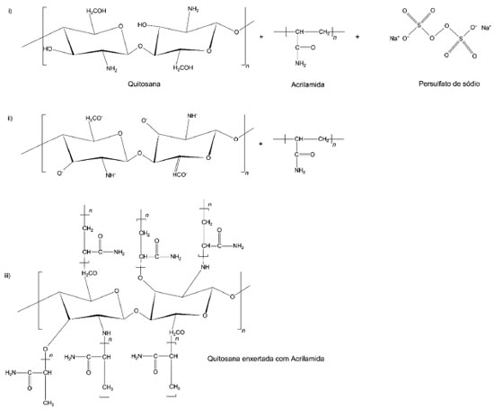 PARTE EXPERIMENTAL Materiais Para enxertia do polímero foram empregados os seguintes reagentes: quitosana e acrilamida adquiridos pela Sigma-Aldrich®; e ácido acético, hidróxido de sódio, etanol, persulfato de sódio adquiridos pela Synth®. Todos os reagentes foram empregados sem preparo prévio. As amostras de rejeito foram obtidas a partir do rejeito de mineração da extração de minerais não metálicos provenientes da região de Esmeraldas, Minas Gerais, Brasil. Produção dos floculantes Enxertia de acrilamida no polímero de quitosana O processo de enxertia foi realizado tomando-se como referência o método proposto por Zhang et al.:20 na primeira etapa do processo, 0,5 g de quitosana (grau de deacetilação 75%, massa molar ≈ 33,61x104 g mol-1) foi dissolvida em uma solução aquosa de ácido acético (1 wt%). Posteriormente, adicionou-se 5 mL de solução aquosa de persulfato de sódio (0,28 wt%) para formação de radicais livres. A mistura foi mantida sob temperatura de 60 ºC e agitação de 100 rpm durante 1 h (etapa i, Figura 1) em um balão de três pescoços equipado com um misturador e um termômetro.