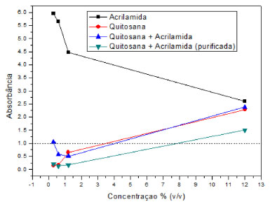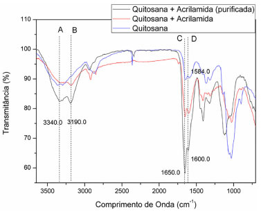 ![]() Figura 2. FTIR realizada com amostras de quitosana pura (curva de cor azul) e quitosana enxertada com acrilamida não purificada (curva de cor vermelha) e purificada (curva de cor preta)