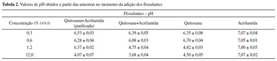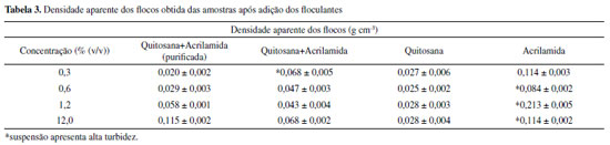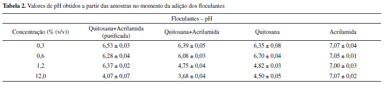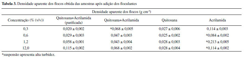 Teste de floculação A Tabela 2 exibe os valores de pH do meio obtidos a partir das amostras após a adição dos floculantes, e as Figuras 4, 5, 6 e 7 apresentam as imagens retiradas das amostras a partir dos ensaios de floculação. A Tabela 3 apresenta os valores de densidade aparente dos flocos.