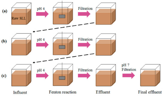 ![]() Figure 1. Experimental setup of the triple-stage Fenton process: a) first stage, b) second stage and c) third stage. SSL: Sanitary landfill leachate