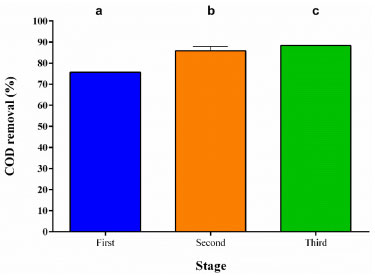 ![]() Figure 2. Accumulated chemical oxygen demand (COD) removal corresponding to each stage of Fenton process. Different letters indicate statistical differences (p < 0.05) according to an LSD test