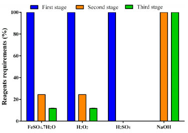 ![]() Figure 3. Comparison of reagents requirements among the three stages of Fenton process. Fe2SO4·7H2O: ferrous sulfate heptahydrate; H2O2: hydrogen peroxide; H2SO4: sulfuric acid; NaOH: sodium hydroxide