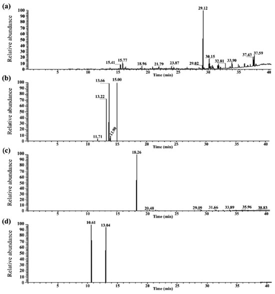 ![]() Figure 5. Total ion chromatogram. a) Raw sanitary landfill leachate, b) first stage of Fenton process, c) second stage of Fenton process and d) third stage of Fenton process