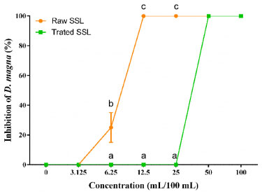 ![]() Figure 6. Percentage inhibition of Daphnia magna following 48 h exposure to dilution series of raw SLL and triple-stage Fenton process effluent (treated SLL) (Range finding test). SLL: Sanitary Landfill Leachate. Different letters indicate statistical differences (p < 0.05)