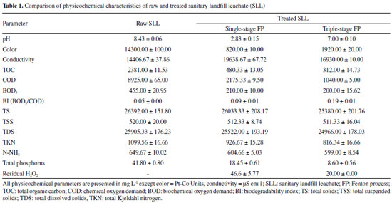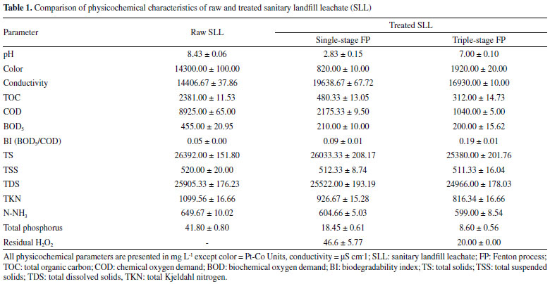 RESULTS AND DISCUSSION Physicochemical characterization The average results (n = 3, ± standard deviation) of the physicochemical characteristics on raw and treated SLL samples are presented in Table 1. Although raw SLL presented a high COD (8925.00 ± 65.00 mg L-1), its low biodegradability index (BOD5/COD ratio of 0.05 ± 0.00), dark color (14300.00 ± 100.00 Pt-Co units) and high N-NH3 concentration (649.67 ± 10.02 mg L-1) corresponded to a stabilized leachate. Hence, this sample should be efficiently treated with chemical process like Fenton oxidation rather than biological process.10