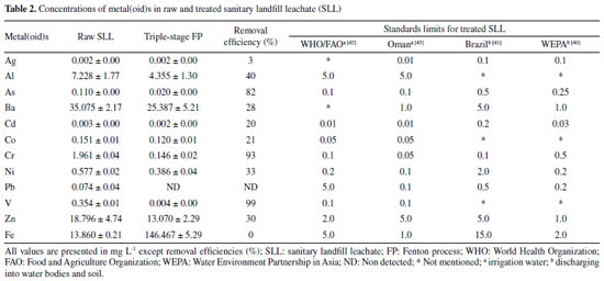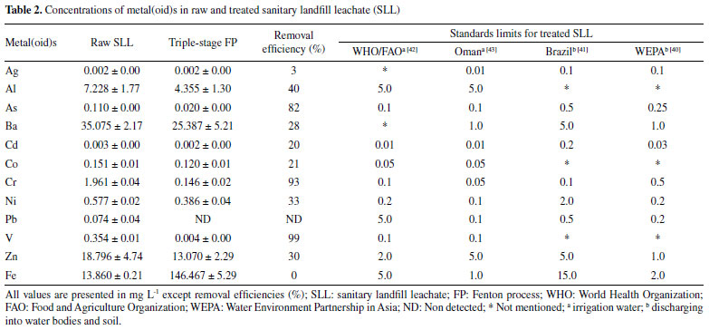 Metal(oid)s concentrations Raw SLL contained detectable concentrations of Ba (35.075 ± 2.17 mg L-1) > Zn (18.796 ± 4.74 mg L-1) > Fe (13.860 ± 0.21 mg L-1) > Al (7.228 ± 1.77 mg L-1) > Cr (1.961 ± 0.04 mg L-1) > Ni (0.577 ± 0.02 mg L-1) > V (0.354 ± 0.01 mg L-1) > Co (0.151 ± 0.01 mg L-1) > As (0.110 ± 0.00 mg L-1) > Pb (0.074 ± 0.04 mg L-1) > Cd (0.003 ± 0.00 mg L-1) > Ag (0.002 ± 0.00 mg L-1) (Table 2). Although most metal(oid)s in SLL are present in low concentrations due to adsorption, precipitation and complexation,34 its release to groundwater may potentially be of an environmental concern35 due to their toxicity and persistence.36 After applying the triple-stage FP, various metal(oid)s (such as V, Cr, As, Al, Ni, Zn and Ba) were reduced in the treated SLL with removal percentages of 99%, 93%, 82%, 40%, 33%, 30% and 28%, respectively (Table 2). For Al, As, Cr, Ni and V, concentrations similar to or below the concentrations permitted by international standards for safe discharge were achieved (Table 2). This decrement evidences the association between the removal of organic compounds and some metals.37 Although there is little information about the mechanism of the removal of metals, it seems that sludge sedimentation sweeps and removes heavy metals from a solution.38 In contrast, because iron is derived from the FP, its concentration in treated SLL substantially increased from 13.860 ± 0.21 to 146.467 ± 5.29 mg L-1 (Table 2). Although iron is abundant in the Earth's crust and occurs naturally in the aquatic environment at levels ranging from 0.5 to 50 mg L-1,39 iron removal should be conducted after the application of the FP in order to achieve international MPLs of iron in wastewater effluents.15 The Water Environment Partnership in Asia (WEPA)40 suggests the discharge limit for iron in general industrial wastewater is 2 mg L-1 while the Ministry of Environment of Brazil41 provides 15 mg L-1 as a MPL for iron discharging into water bodies. For wastewater reuse, FAO/WHO Guidelines42 for trace metals in irrigation water recommended a maximum concentration for iron of 5 mg L-1 while Omani Standard of Wastewater Reuse43 allowed 1 mg L-1 of iron for unrestricted irrigation (vegetables, uncooked crops, sports fields, and publics parks)44 (Table 2).