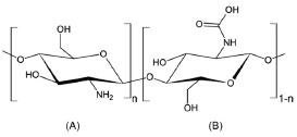 ![]() Figura 1. Representação esquemática da estrutura química das unidades repetitivas de quitina e quitosana, (A) GlcN e (B) GlcNAc