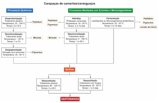 ![]() Figura 2. Processos químicos e mediados por enzimas e micro-organismos para a produção de quitina e quitosana