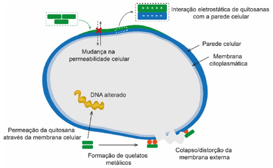 ![]() Figura 4. Representação esquemática dos principais mecanismos de ação das quitosanas frente a micro-organismos