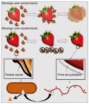 ![]() Figura 5. Ilustração esquemática do processo de proteção contra micro-organismos em morangos revestidos com filmes de quitosana. Adaptada com permissão da ref. 74. Copyright 2020 ELSEVIER
