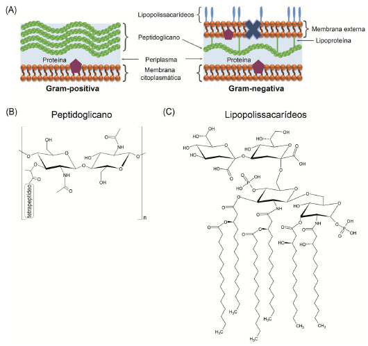 ![]() Figura 6. (A) Ilustração esquemática das membranas celulares de bactérias gram-positivas e gram-negativas e estruturas químicas das moléculas de (B) peptidoglicano e (C) lipopolissacarídeos (LPS)