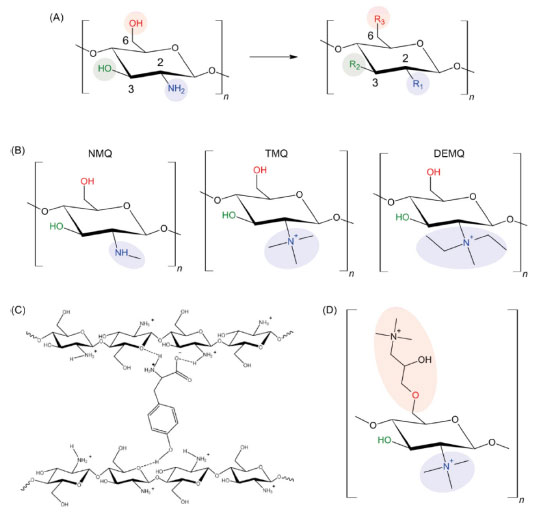 ![]() Figura 7. (A) Esquema sintético ilustrando os grupos funcionais da estrutura química das quitosanas que possibilitam a obtenção de derivados hidrossolúveis. (B) Estruturas químicas dos derivados NMQ, TMQ e DEMQ. (C) Representação esquemática da formação do conjugado quitosana-tirosina através de ligações de hidrogênio. Reproduzido da ref. 154. Copyright 2020 MDPI sob uma licença Creative Commons 4.0 (CC BY) (http://creativecommons.org/licenses/by/4.0/). (D) Estrutura química do derivado N,N,N-trimetil-O-(2-hidroxi-3-trimetilamônio propil)