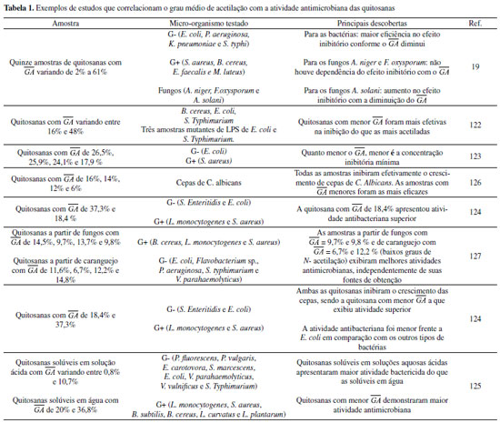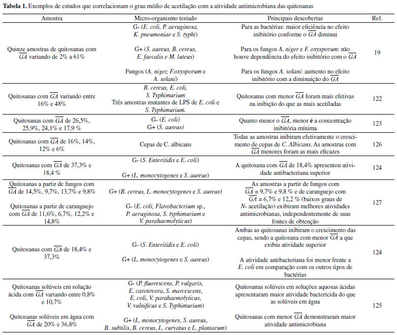 INFLUÊNCIA DAS CARACTERÍSTICAS ESTRUTURAIS DAS QUITOSANAS NA ATIVIDADE ANTIMICROBIANA Conforme mencionado anteriormente, as características estruturais das quitosanas influenciam em suas propriedades funcionais, impactando diretamente sua solubilidade, viscosidade, biodegradabilidade, cristalinidade, biocompatibilidade e bioatividade.24,110 Dentre as características físico-químicas do polissacarídeo, o Grau médio de acetilação ( O grau médio de acetilação ( Em estudos realizados por Younes et al., em 2014,19 quinze amostras de quitosanas com diferentes graus de acetilação e homogeneidade em relação à distribuição dos grupos acetilados nas cadeias foram utilizadas para investigar a eficácia antimicrobiana contra bactérias G- (Escherichia coli, Pseudomonas aeruginosa, Klebsiella pneumoniae e Salmonella typhi), G+ (Staphylococcus aureus, Bacillus cereus, Enterococcus faecalis e Micrococcus luteus) e fungos (Aspergillus niger, Fusarium oxysporum e Alternaria solani). Os autores observaram maior eficiência no efeito inibitório com a diminuição do Mellegård et al.122 utilizaram amostras de quitosana solúveis em água com fração de acetilação (FA) de 0,16 e 0,48 ( Em outro estudo comparativo, Yuan et al.123 avaliaram o efeito de quitosanas com quatro valores diferentes de Byun et al.124 avaliaram o efeito inibitório de quitosanas com Já os estudos realizados por Jung et al.125 compararam as atividades antibacterianas de seis quitosanas solúveis em soluções aquosas ácidas e duas amostras de quitosanas solúveis em água com diferentes A Tabela 1 apresenta os trabalhos científicos que correlacionam a atividade antimicrobiana das quitosanas ao
