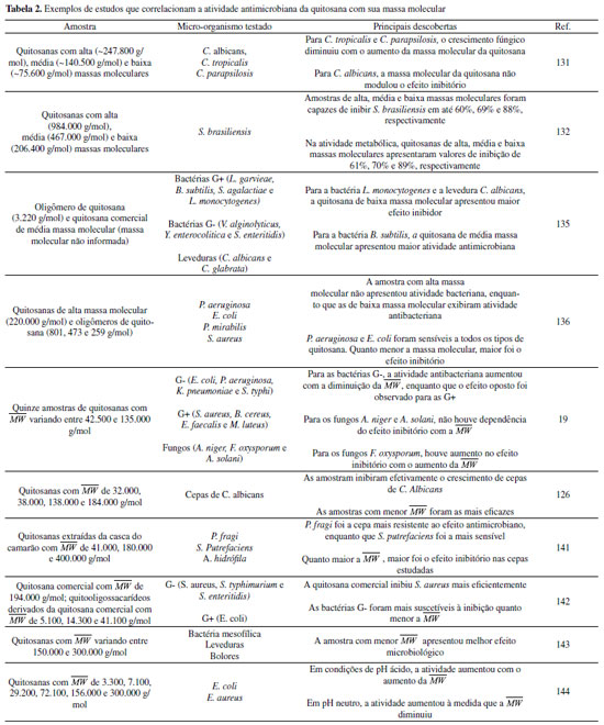 Massa molecular média ( Muitas propriedades físico-químicas e estruturais de uma cadeia polimérica são definidas pela sua massa molecular média ( Conforme discutido nas seções anteriores, é possível obter amostras de quitosanas com Garcia e colaboradores131 mostraram alterações na atividade antifúngica utilizando três quitosanas com Outros resultados também sugerem relação na redução do crescimento e multiplicação dos micro-organismos de acordo com a Bano e colaboradores136 conduziram um estudo investigando a atividade bacteriana de quitosanas com Os diferentes comportamentos observados em função da variação A Tabela 2 apresenta os estudos que correlacionam a atividade antimicrobiana da quitosana com a sua