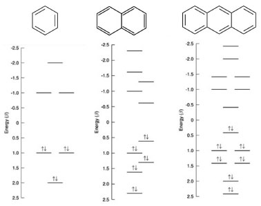 ![]() Figure 1. Molecular structure and the resulting energy level of (a) benzene, (b) naphthalene, and (c) anthracene from Hückel theory