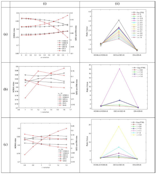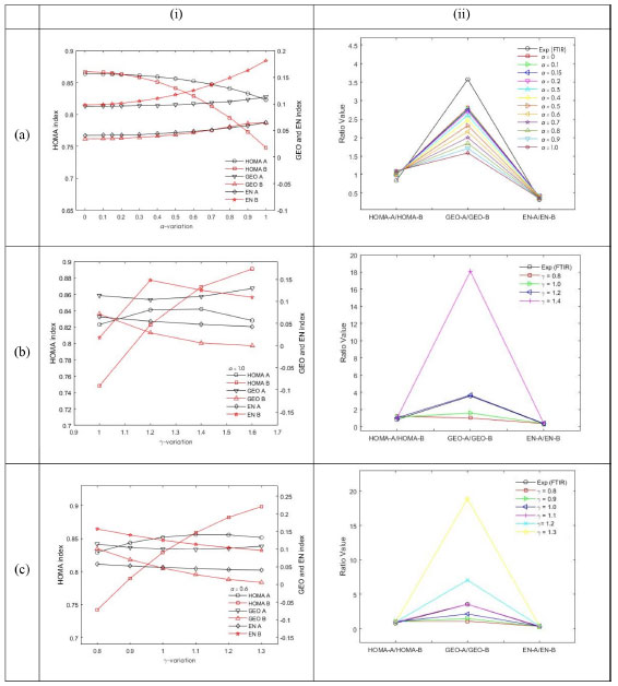 ![]() Figure 4. (i) HOMA, GEO, and EN indices for the outer benzene ring (A) and central benzene ring (B) of the anthracene, and (ii) the ratio of HOMA, GEO, and EN indices of the two benzene rings, for the variation of: (a) Coulomb integral (a) for γ = 1, (b) resonance integral (γ) for a = 1, and (c) resonance integral (γ) for a = 0.6. In figs (ii) the corresponding values from Ref. [33] are also shown for comparison