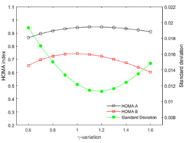 Upon variation of a, we found a non-monotonous variation in the HOMA indices. A qualitative agreement with previous studies, where HOMA-B > HOMA-A was obtained for a < 0.3. For γ variation with a = 1.0, the condition of HOMA-B > HOMA-A was obtained for γ ≥ 1.3. However, in both cases, the ratio values of HOMA, GEO, and EN for the two non-equivalent benzene rings are relatively far from the values obtained from the experimental results (as most clearly observed for the GEO ratio, except for a = 1 and γ = 1.2). The best result was obtained for a = 0.6 and γ = 1.1 (Figure 4(c)). Applying the same method to phenanthrene, Figure 5 illustrates the HOMA index and the standard deviation value of bond length upon γ variation for a = 0.6. From this figure, HOMA-A > HOMA-B for all γ values. From the three criteria mentioned above, the best result was obtained for a = 0.6 and γ = 1.2, along with the smallest standard deviation value.