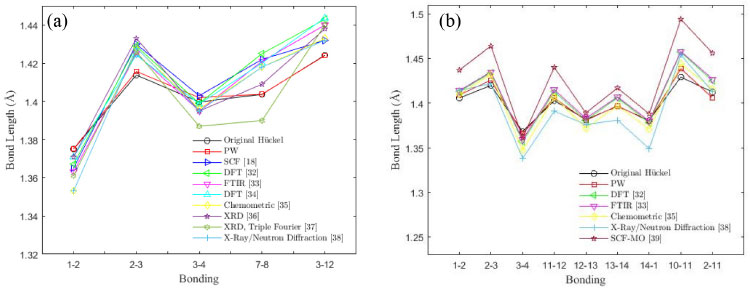 ![]() Figure 6. Bond lengths (a) anthracene and (b) phenanthrene for the best results in the present work compared with the results from original Hückel parameters and previous studies18,32-39