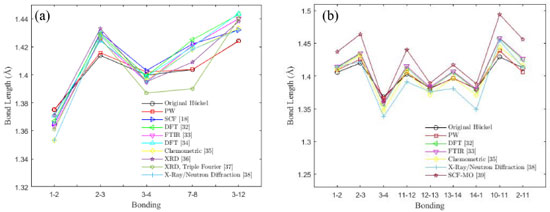 To further validate the result, the calculated bond lengths for some unique bonds of the two molecules for the best parameters, a = 0.6 and γ = 1.1 for anthracene and a = 0.6 and γ = 1.2 for phenanthrene, were compared to previous theoretical and experimental studies, as shown in Figure 6. From this figure, one can see a good agreement for the bond order and bond length pattern with the results of previous studies. For the best results in the correction of the Hückel parameters, the improvement in the standard deviation value of the bond length compared to the original Hückel method was 4.39% for anthracene and 16.71% for phenanthrene.