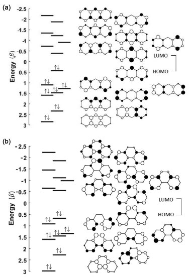 ![]() Figure 7. Molecular energy level diagram of (a) anthracene and (b) phenanthrene for the best result to a correction of Hückel parameters and the associated molecular orbitals. The black and white circles indicate the positive and negative coefficients of SALC, respectively