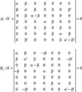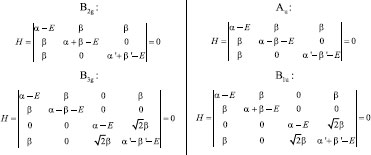 The symmetry group of the anthracene is D2h8 with a character table shown in Table 1.7 This group contains eight elements: the identity element (I), three rotations through angle π about the coordinate axes (C2z, C2y, C2x), the inversion (i), and three reflections (σxy, σxz, σyz). As we see in Table 1, all the irreducible representations of D2h are one-dimensional; hence, no degeneracy should be expected.