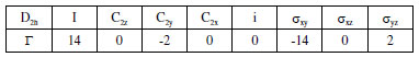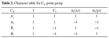 On the other hand, the symmetry group of the phenanthrene is C2v8, which contains four elements: the identity element (I), rotation through angle π about z the coordinate axes, and two vertical plane reflections (σxz, σyz). The corresponding character tables are listed in Table 2.7,27