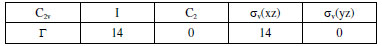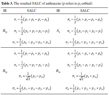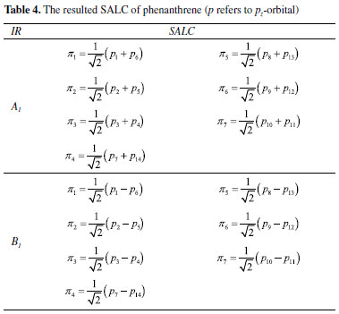The representation in Table 2 can be reduced into the irreducible ones, namely ![]() The corresponding IRs and SALCs for phenanthrene are shown in Table 4.